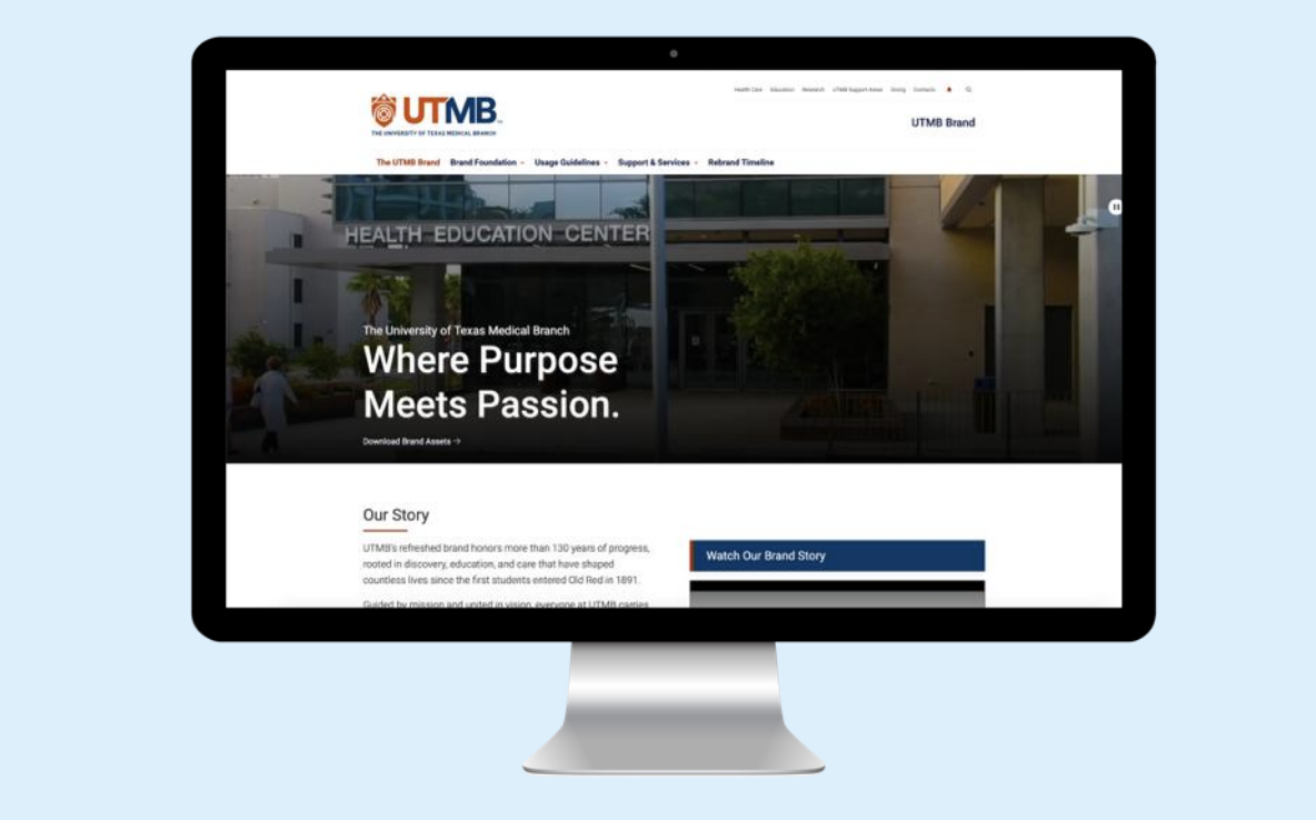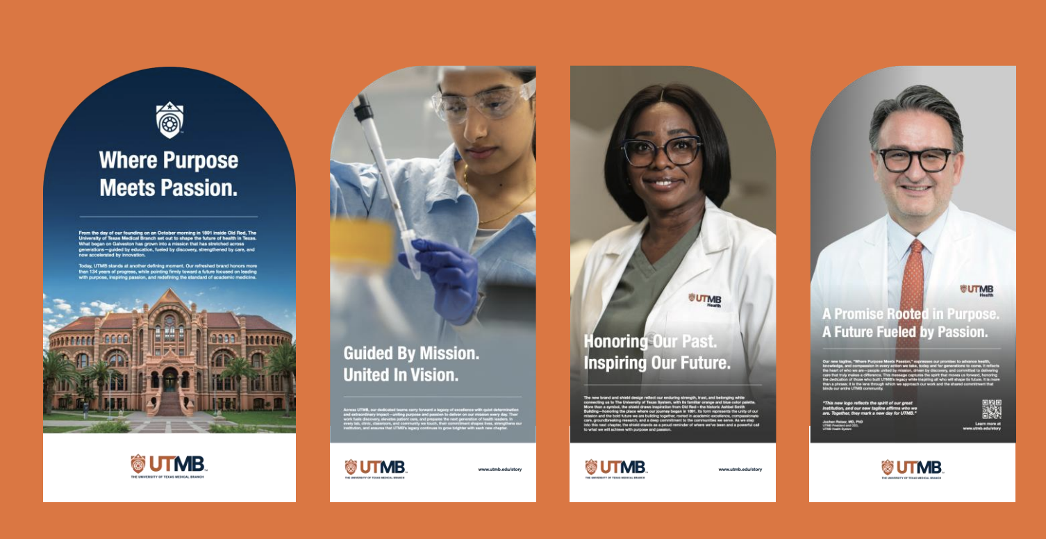 We began with listening. Our team conducted stakeholder interviews across clinical, academic and administrative areas, analyzed internal and external feedback, and benchmarked peer institutions. Clear themes emerged: trust, expertise, compassion and community. From these insights, we built a new brand platform and tagline anchored in a defining promise: “Where Purpose Meets Passion.” The line captures UTMB’s commitment to clinical excellence and the human connection that drives it, uniting care, education and research under one clear voice.