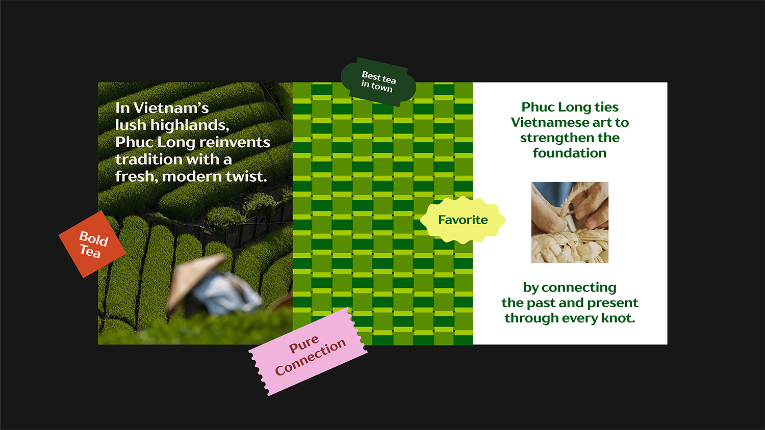 The primary pattern, inspired by Vietnamese woven tea baskets, the very vessels that once carried fresh tea on the shoulders of tea pickers, embodies the layered spirit of Pure Connections. Each interlaced weave represents heritage, craft, human bonds intertwined across generations.